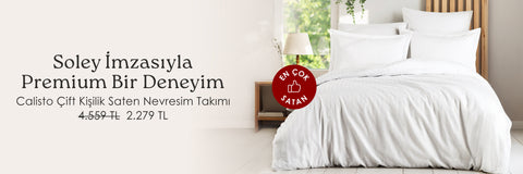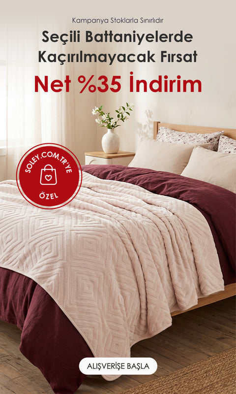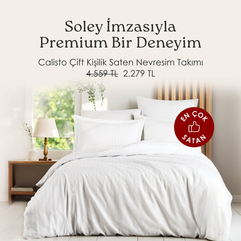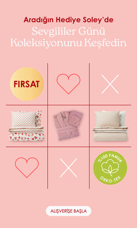 Evde geçirdiğiniz anları daha özel ve rahat kılmak için Soley, kaliteli ve şık tekstil ürünleriyle yanınızda. Sofralarınızdan yatak odalarınıza, banyodan salona kadar her alanda estetik ve konforu bir araya getiren koleksiyonlarımız, modern tasarımları ve çevre dostu malzemeleriyle fark yaratıyor. %100 pamuk nevresim takımları, porselen yemek takımları ya da yumuşacık bornozlar ile evinizin her köşesine zarafet katın.Havlu ve bornoz modellerimiz, cilt dostu dokuları ve yüksek emicilikleriyle banyo keyfinizi artırıyor. Yatak odalarınızı nevresim takımı, çarşaf, pike ve yatak örtüsü seçeneklerimizle yenileyin; yastık, yorgan ve battaniye ile konforu tamamlayın. Lastikli çarşaf modellerimiz ise pratik kullanımı ve mükemmel oturumu ile her gece huzurlu bir uyku vadediyor. Yastıklarınızın şık görünmesi sizin için değerli ise onları en güzel kıyafetler ile yani yastık kılıfı ile giydirebilirsiniz. Tüm yastık, yorgan, battaniye gibi yatak odası malzemelerinizi ve kıyafetlerinizi organize edebileceğiniz hurç kategorisindeki ürünlerimize de göz atabilirsiniz. Yatak kenarlarında kıvrılma yapmayan, sabaha kadar yerinde duran tasarımıyla hem zaman kazandırıyor hem de estetik görünümü koruyor. Alez ile yatağınızı koruyun, yemek takımı koleksiyonumuzla sofralarınıza şıklık katın. Kahve fincan takımları, tabak ve kase seçenekleri ile günlük kahve keyfinizi renklendirin; özel günlerde ise pasta sunum setleri ile masalarınıza zarif bir dokunuş ekleyin. Ayrıca bebekleriniz için %100 pamuk kumaş içeren kundak modellerine göz atabilirsiniz. Zengin ürün yelpazemiz, hem görsel şıklığı hem de doğal esansların sunduğu huzuru bir araya getirerek yaşam alanlarınızı güzelleştiriyor.OEKO-TEX® sertifikalı ürünlerimiz, çevreye duyarlı ve sağlıklı bir yaşam sunar.Soley ile evinizi yeniden keşfedin! Kalite, estetik ve sürdürülebilirlik için hemen koleksiyonlarımıza göz atın.Aynı Gün Kargo
