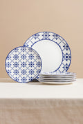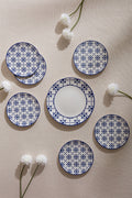 - 6 Adet Küçük Pasta Tabağı (19 cm): Tamamı mavi geometrik ve floral motifli desen.